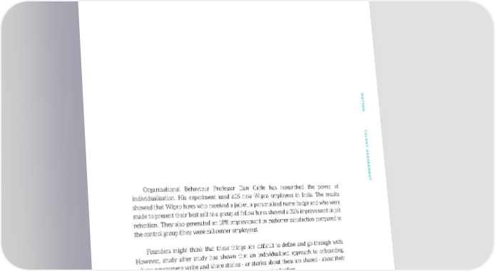 NONO TION TTION T ALENT AALENT A SS SESSES SMENTSMENT Organisational Behaviour Professor Dan Cable has researched the power of individualisation. His experiment used 605 new Wipro employees in India. The results showed that Wipro hires who received a jacket, a personalised name badge and who were made to pr esent their best self to a gr oup of fellow hires showed a 32% improvement in job retention. They also generated an 18% improvement in customer satisfaction compared to the control group (they were call center employees). Founders might think that these things are difficult to define and go through with. However, study after study has shown that an individualised approach to onboarding, where newcomers write and share stories - or stories about them are shared - about their best selves with others, leads to greater performance and retention. Julia Lee, a Professor of the University of Michigan, found that those who undergo relational best-self activation experience significantly less anxiety, negativity and over 200% creative problem solving enhancement. Onboarding goes at the heart of the new war for talent - not wooing employees away from competitors, but unleashing the enthusiasm that is already there within employees, but dormant. 110101
