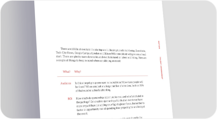 EVENTS NONO TION TTION T There are 1000s of events in the startup world. Staying tuned in to Meetup, Eventbrite, Tech City News, Google Campus London and Silicon Milkroundabout will give you a head start. There are plenty more directories and events focused on talent and hiring. Here are ALENT AALENT A a couple of things to keep in mind when considering an event: SS SESSES What? Why? SMENTSMENT Audience Is this a target group you want to recruit from? How many people will be there? When you look at a large number of attendees, bank on 50% of that number actually attending. ROI How much do sponsorship opportunities cost, and what’s included in the package? Get creative: sponsoring a lunch at an event may have more impact than just adding your logo to glossy flyers. Remember to factor in opportunity cost of spending time preparing for and being at the event. Speakers Are the speakers the kind of people you want to recruit and is the content relevant to what you’re doing? Better yet, can sponsorship guarantee a speaking slot? Past Is this an event that has been successful for recruiting in the past? Do Experience other companies rate it? Can you get an honest opinion from someone? Resources Do you have sufficient employee resources/time to have a meaningful presence at the event? 3737