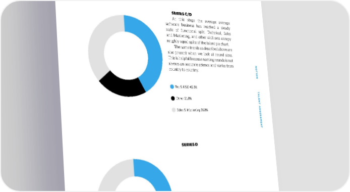 _ SERIES C/D At this stage the average average software business has reached a steady state of functional split. Technical, Sales and Marketing, and other skill sets occupy roughly equal splits of the talent pie chart. The same trends as described above are also present when we look at round sizes. This is helpful because naming rounds is not always an accurate science and varies from NONO country to country. TION TTION T Tec & R&D 42.3% ALENT AALENT A Other 21.8% SS Sales & Marketing 35.8% SESSES SMENTSMENT SERIES D Tech & R&D 34.3% Other 30.8% Sales & Marketing 34.9% 2525