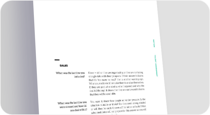 NONO TION TTION T _ ALENT AALENT A SS SALES SESSES When was the last time you Never = either they are sugarcoating or they are not taking SMENTSMENT lost a deal? enough risks with their prospects. If their answer indicates that it’s “too many to recall” that is another warning sign. What you really want here is for them to analyse themselves. If they are good at analysing what happened and why the deal fell through it shows that they are mature and indicates that they will be coachable. When was the last time you You want to know how people act under pressure. Is the were stressed and how did situation relatable or trivial? Do they seem strong minded you deal with it? or will they be easily thrown off by minor setbacks? Most sales candidates will not prepare for this answer so you will uncover real personal traits. When was the last time you Is the candidate a risk-taker or not? They should be, to took a big risk and it didn’t some degree. They have to be comfortable pushing their pan out? own boundaries. The risk itself doesn’t have to be related to selling, it can be anything in life. You just want to know that when this person sees an opportunity, they’ll go for it. Taking risks speaks to a killer instinct and a confidence that will translate really well in selling. 8181