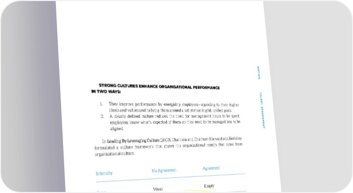 WHY IS IT IMPORTANT TO DEFINE CULTURE AND VALUES? NONO TION TTION T STRONG CULTURES ENHANCE ORGANISATIONAL PERFORMANCE IN TWO WAYS: ALENT AALENT A 1. They improve performance by energising employees—appealing to their higher SS ideals and values and rallying them around a set of meaningful, unified goals. SESSES 2. A clearly defined culture reduces the need for management hours to be spent; employees know what’s expected of them so they need to be managed less to be SMENTSMENT aligned. In Leading By Leveraging Culture (2003), Chatham and Cha from Harvard and Berkeley formulated a culture framework that shows the organisational results that come from organisational culture. Intensity No Agreement Agreement Low Weak Empty High Warring Fractions Strong Agreement Do people agree on the culture? Intensity Do people feel strongly about the culture? Founders want their company to be in the bottom right corner. 1111