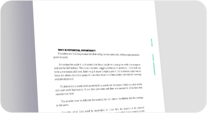 POTENTIAL: INTERVIEW TECHNIQUES AND QUESTIONS NONO TION TTION T WHY IS POTENTIAL IMPORTANT? Founders are building companies that will grow exponentially, while people generally ALENT AALENT A grow linearly. SS As companies scale it is invaluable to have people who can grow with the company SESSES and not be left behind. This does not mean pegging all hopes on potential - there still has to be a minimum skill level. But it might mean foregoing some tried and tested experienced SMENTSMENT hires for others founders gauge to have less experience but greater potential for learning and development. To determine a candidate’s potential to succeed, we recommend that you start at the end and work backwards. If you hire someone and they are successful, what does that success look like? The answer may be different between junior and senior candidates, but the strategy is the same. Consider what they need to accomplish in their first six months to be deemed successful. Chances are it means acquiring skills and knowledge that they currently do not possess. The universal identifiers of potential are extensive learning capabilities, flexibility, a positive attitude, a desire to grow, high performance, high emotional intelligence, honesty and a vision for the future. As a final note: try to notice if the candidate has the ability to say “I don’t know”. If they can’t say “I don’t know,” they probably won’t ask for help, and their potential is limited. As the interviewer, you should be able to come up with a question about some esoteric but interesting piece of knowledge. They should show curiosity as to what the answer is. 8888
