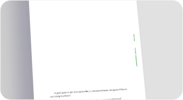NONO TION TTION T ALENT AALENT A SS SESSES SMENTSMENT A good place to start is to outline the purpose of performance management.What are you trying to achieve? • Are you attempting to create a stronger link between pay and performance? • Are you identifying top performers (as well as under-performers) so you can make more effective promotion decisions? • Do you need to address employee engagement levels? If so, how will you measure employee engagement to ensure your new performance management framework is making progress? • Do your employees need more praise, recognition, and/or clarity of expectations? Are you providing enough feedback? How do you know? • Are you trying to create a more goals-driven company culture? 112112