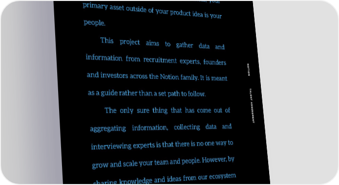 When you’re building a SaaS business, your primary asset outside of your product idea is your people. This project aims to gather data and information from recruitment experts, founders NO TION T and investors across the Notion family. It is meant as a guide rather than a set path to follow. ALENT A S The only sure thing that has come out of SES SMENT aggregating information, collecting data and interviewing experts is that there is no one way to grow and scale your team and people. However, by sharing knowledge and ideas from our ecosystem we hope to reinforce proven solutions, uncover challenges and provide new ideas for solutions in how to build a successful enterprise software team. 5