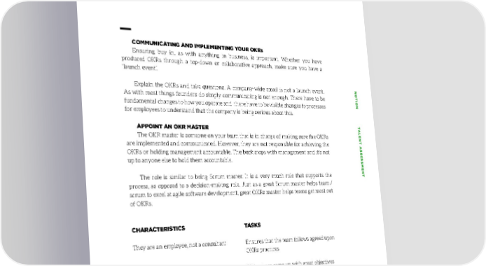 _ COMMUNICATING AND IMPLEMENTING YOUR OKRs Ensuring buy in, as with anything in business, is important. Whether you have produced OKRs through a top-down or collaborative approach, make sure you have a ‘launch event’. Explain the OKRs and take questions. A company-wide email is not a launch event. NONO As with most things founders do simply communicating is not enough. There have to be TION TTION T fundamental changes to how you operate and there have to be visible changes to processes for employees to understand that the company is being serious about this. APPOINT AN OKR MASTER ALENT AALENT A The OKR master is someone on your team that is in charge of making sure the OKRs are implemented and communicated. However, they are not responsible for achieving the SS OKRs or holding management accountable. The buck stops with management and it’s not SESSES up to anyone else to hold them accountable. SMENTSMENT The role is similar to being Scrum master. It is a very much role that supports the process, as opposed to a decision-making role. Just as a great Scrum master helps team / scrum to excel at agile software development, great OKRs master helps teams get most out of OKRs. CHARACTERISTICS TASKS They are an employee, not a consultant Ensures that the team follows agreed upon OKRs practices An operational guru Helps team come up with great objectives (executives should not hold this role) and key results Enthusiastic about OKRs Facilitates OKRs adoption Enjoys mentoring and coaching Mentors and coaches team on OKRs process Organized and committed Administrates OKRs tools 110110