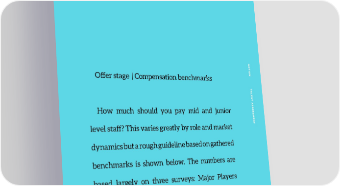 NO TION T Offer stage | Compensation benchmarks ALENT A S How much should you pay mid and junior SES SMENT level staff? This varies greatly by role and market dynamics but a rough guideline based on gathered benchmarks is shown below. The numbers are based largely on three surveys: Major Players 2018 survey (3000 surveyed), Reco Group (1000 surveyed and 210 surveyed online) and Propel’s Digital Salary Survey (1261 surveyed). 93