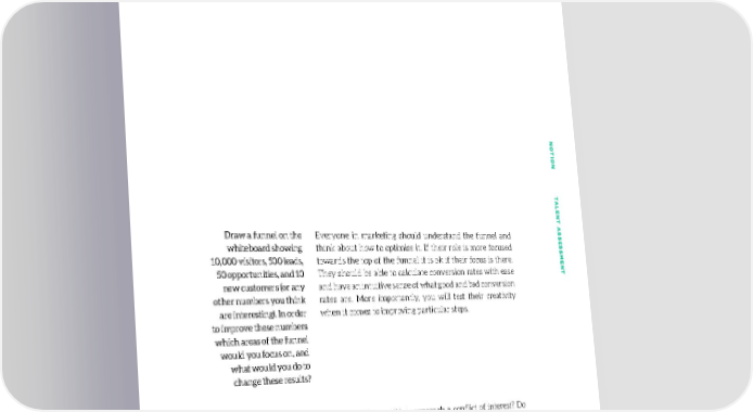 NONO TION TTION T ALENT AALENT A SS Draw a funnel on the Everyone in marketing should understand the funnel and SESSES whiteboard showing think about how to optimise it. If their role is more focused 10,000 visitors, 500 leads, towards the top of the funnel it is ok if their focus is there. SMENTSMENT 50 opportunities, and 10 They should be able to calculate conversion rates with ease new customers (or any and have an intuitive sense of what good and bad conversion other numbers you think rates are. More importantly, you will test their creativity are interesting). In order when it comes to improving particular steps. to improve these numbers which areas of the funnel would you focus on, and what would you do to change these results? We have two potential How does the candidate approach a conflict of interest? Do designs for the homepage they care what people think, or do they go to the data for of our website supported their answers, such as through A/B testing, user testing, by different parts of the and customer interviews? The best candidates introduce business. How do you logic and marketing methodology into their answers, while decide? removing opinions. Another plus will be candidates who say you should be constantly testing, tweaking and improving the website, rather than always doing a complete redesign every now and again. 8383