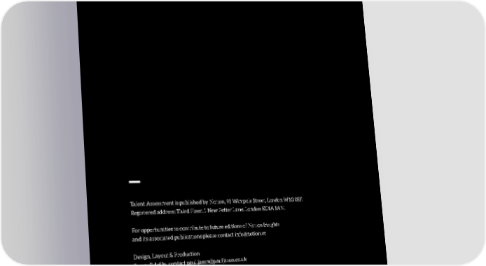 _ Talent Assessment is published by Notion, 91 Wimpole Street, London W1G 0EF. Registered address: Third Floor, 1 New Fetter Lane, London EC4A 1AN. For opportunities to contribute to future editions of Notion Insights and its associated publications please contact [email protected] Design, Layout & Production SunnySideUp, contact [email protected] Notion (OC364955) is Authorised and Regulated by the Financial Conduct Authority. _ Reproduction in whole or in part without written permission is strictly prohibited. © 2019 Notion. All rights reserved.