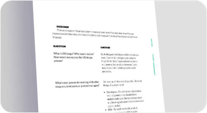 DESIGNER Themes to explore: Understand their creative process, how they seek ideas, how they get inspired and whether they are visual and able to communicate in both technical and non-technical language. NONO TION TTION T QUESTION ANSWER What is UX design? Why does it matter? Each designer will share a different unique ALENT AALENT A How would you explain the UX design work flow which will give you valuable process? insight into their organisational patterns SS and general technical preferences. Look SESSES for a match with existing systems and processes. SMENTSMENT What’s your process for working with other Get a sense of their working style. Like most designers, developers, or product managers? things it’s a team sport. • Developers — For effective collaboration with engineers they should show understanding for the technology stack and have a good sense of constraints and opportunities. • PMs — To work well with product managers, they should translate prototypes into proper specifications, usually in the form of detailed stories. • Designers — Designers typically have continuous cycles of pairing and siloing, followed by structured critique sessions. Having self-awareness about the way they work and demonstrating flexibility is the key to success. 6767