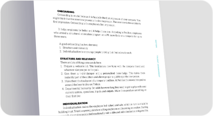 ONBOARDING Onboarding is crucial because it is basically the first impression of your company. You might think that the interview process is the first impression. The interview is the candidate’s first impression. Onboarding is the employee’s first impression. It helps employees be better and it helps them stay. According to Perkbox, employees who attend a structured orientation program are 69% more likely at a company for up to three years. NONO TION TTION T A good onboarding has two elements: 1. Structure and relevancy 2. Individualisation to encourage people to bring their best selves to work. ALENT AALENT A STRUCTURE AND RELEVANCY There are lots of things you can do here: SS 1. Prepare a welcome kit. This familiarises new hires with the company brand and SESSES whatever else you put in the pack. 2. Give them a t-shirt/jumper and a personalised name-badge. This makes them SMENTSMENT instantly part of the culture and allows people to quickly spot the new person. 3. Make them the focal point of a company tradition. At Perkbox the newest hire pushes around the beer trolley on Fridays. 4. Departmental bootcamp. Set aside however long they need to get to grips with your current system, operations, inputs and outputs. Make them produce something on their first day. INDIVIDUALISATION Individualisation makes the employee feel valued and safe, which in turn is crucial to building trust. Trust is a prerequisite to enabling employees and fostering innovation. Starting a new job also makes people feel emotionally vulnerable and individualisation mitigates this. 1. Talk to them about their specific role Their manager should explain expectations and processes 2. Show them what success looks like A star employee can introduce the role and the company 3. Give them personalised swag Name badge, computer with a sticker, etc. 4. Best self activation Either get friends / next of kin (relational) or themselves to write about the employee’s best characteristics and share it 100100