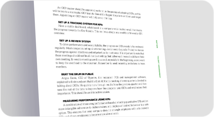 An OKR master should be appointed early on in the process of adopting OKRs, as this will be key to a successful OKR launch. One of the biggest traps is to set them and forget them. Appointing an OKR master will help avoid this trap. SET UP A TRACKING SYSTEM FOR KPIs Have a visible dashboard, whiteboard or a company-wide tracker email that tracks the progress towards the Key Results. This can be as simple as a weekly or bi-weekly KPI overview. NONO SET UP A REVIEW SYSTEM TION TTION T To drive performance and accountability, the progress on OKRs needs to be reviewed regularly. Most companies set up short meetings every week (typically Friday) to discuss the progress against objectives and set priorities for next week. It is important to note that those meetings should not be all-hands meetings, but rather each team should have their ALENT AALENT A own meeting. Bi-weekly meetings are fine as well, especially in the beginning, as you want to keep the overhead to the minimum. Remember to send recurring invitations to team SS members. SESSES BEAT THE DRUM IN PUBLIC SMENTSMENT Angus Davis, CEO of Upserve, the restaurant POS and management software, explained to firstround.com tha t the first ‘All Hands’ meeting of every quarter is devoted to talking about OKRs. He quickly runs through results from the previous quarter and then uses the rest of the time to improve how the company uses OKRs and emphasises their importance. This should be an interactive session. MEASURING PERFORMANCE USING KPIs A combination of measuring performance based on meeting quantitative KPIs and on more intangible adherence to culture/values and displays of desired behaviour is a safe option. This ensures that your company does not strangle employees with only numeric KPIs and allows employees to become more alive at work. “We need people to know how they’re doing.” Laszlo Bock, SVP, People Operations, Google PERFORMANCE MANAGEMENT Measuring performance starts with setting targets. Therefore, be honest with yourself: have you and your middle managers defined KPIs and OKRs well enough so that it is clear to employees at any level what is expected from them. Make sure you have gone through the steps outlined above before thinking about performance assessment. 111111