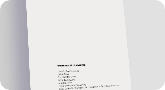 APPENDIX ONLINE PLACES TO ADVERTISE LinkedIn (Sales/Marketing) Github (Devs) StackOverflow (Devs) White Truffle (D evs) AngelList (Tech) Hacker News Who’s Hiring (Tech) Reddit London For Hire thread (Tech) Unicornhunt.io (Tech/Design/Marketing) KD Nuggets (Data Scientists) WorkInStartups (Tech/Design/Marketing/Interns) London Startup Jobs (General) Escape the City (Non-tech) Intern Avenue (Interns) Glassdoor (All) Indeed (All) Reed (All) TotalJobs (All) Monster (All)