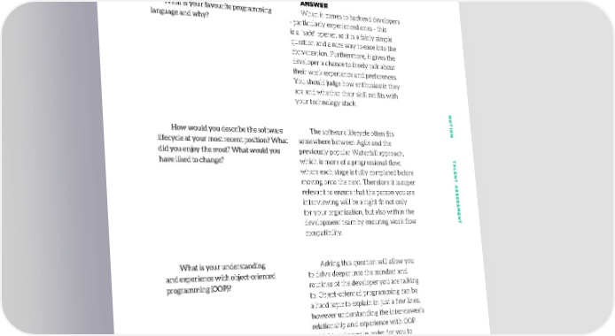 BACKEND Themes to explore: Does their skill set fit your existing tech stack, do they know computer science first principles, are they good problem solvers and can perform quick critical thinking. QUESTION ANSWER What is your favourite programming When it comes to backend developers language and why? - particularly experienced ones - this is a “safe” opener, as it is a fairly simple question and a nice way to ease into the conversation. Furthermore, it gives the developer a chance to freely talk about their work experience and preferences. You should judge how enthusiastic they are and whether their skill set fits with your technology stack. NONO TION TTION T How would you describe the software The software lifecycle often fits lifecycle at your most recent position? What somewhere between Agile and the did you enjoy the most? What would you previously popular Waterfall approach, have liked to change? which is more of a progressional flow, ALENT AALENT A where each stage is fully completed before moving onto the next. Therefore it is super SS relevant to ensure that the person you are SESSES interviewing will be a right fit not only for your organisation, but also within the SMENTSMENT development team by ensuring work flow compatibility. What is your understanding Asking this question will allow you and experience with object-oriented to delve deeper into the mindset and programming (OOP)? routines of the developer you are talking to. Object-oriented programming can be a hard topic to explain in just a few lines, however understanding the interviewee’s relationship and experience with OOP is highly relevant in order for you to get a better understanding of what kind of software developer you are dealing with. Since the late 90’s OOP has been the general practice when organising code, which is a way of generalising and objectifying certain groups of code and making it possible to apply them to various situations. 6464