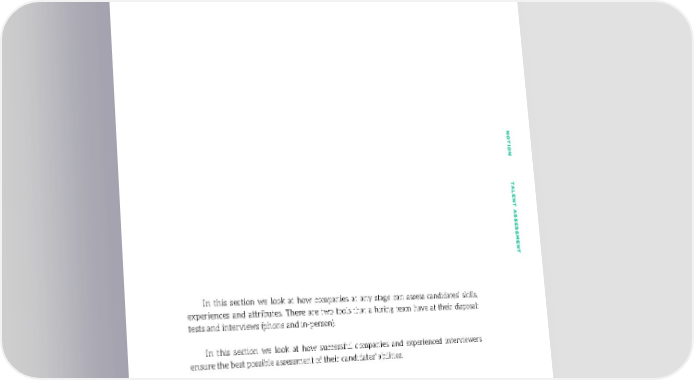 CAN THEY DO THE JOB? NONO TION TTION T ALENT AALENT A SS SESSES SMENTSMENT In this section we look at how companies at any stage can assess candidates’ skills, experiences and attributes. There are two tools that a hiring team have at their disposal: tests and interviews (phone and in-person). In this section we look at how successful companies and experienced interviewers ensure the best possible assessment of their candidates’ abilities. WHY USE SKILLS TESTS? 1. First, CVs should not stand alone. As the single mode of assessing candidates, they’re increasingly outdated. They give an overview of what a candidate did and where, but not how they performed or even what they really did. 2. Increase potential reach. When using job boards with CV criteria, you are only able to get candidates who are actively looking for a job. If you market tests you can actually find qualified and interesting candidates based in the first instance on skill rather than experience. 5858