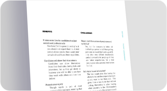 NONO BENEFITS CHALLENGES TION TTION T It takes some time for candidates to adjust Does it limit the number of people you end socially and professionally up hiring? ALENT AALENT A Few hires “hit the ground running” and Yes, but the company is better off you should not expect them to. A trial not hiring a person at all than getting SS period allows you to check candidates’ someone on board that’s not a good fit. SESSES actual cultural fit and their capabilities. It is often very difficult (emotionally and otherwise) to let people go if they SMENTSMENT Candidates will show their true colours are below expectations, but a trial Candidates can show themselves period gives you a process /mechanism from their best sides during tests and for that. interviews, but as they get down to business you will be able to see how Is it viable in a seller’s market? they work with others and how they The best people often like having the deliver. ability to test out the company (as much as you want to test them out). This Protects your equity gives them a way to do that without Though equity is part of most locking themselves in after hearing compensation packages, ensuring that what amounts to the CEO/founder’s even though shares vest from the start sales pitch on why the company is such date any termination before the end of a great place to work. They get a chance the trial period will return the shares to to find out for themselves. the company. What about referred candidates or candidates that have been courted? Same rules apply. Though you should still allow the referring person to be the “evangelist” after the trial period. 110303
