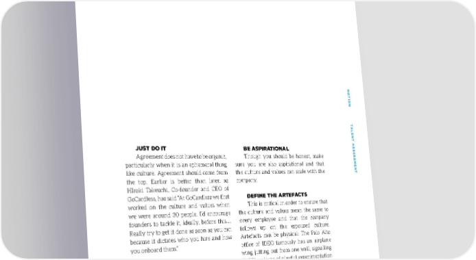 AGREEMENT NONO TION TTION T ALENT AALENT A SS JUST DO IT BE ASPIRATIONAL SESSES Agreement does not have to be organic, Though you should be honest, make particularly when it is an ephemeral thing sure you are also aspirational and that SMENTSMENT like culture. Agreement should come from the culture and values can scale with the the top. Earlier is better than later, as company. HIroki Takeuchi, Co-founder and CEO of GoCardless, has said “At GoCardless we first DEFINE THE ARTEFACTS worked on the culture and values when This is critical in order to ensure that we were around 30 people. I’d encourage the culture and values mean the same to founders to tackle it, ideally, before this…. every employee and that the company Really try to get it done as soon as you can follows up on the espoused culture. because it dictates who you hire and how Artefacts can be physical: The Palo Alto you onboard them.” office of IDEO famously has an airplane wing jutting out from one wall, signalling BE HONEST IDEO’s culture of playful experimentation Though the founder(s) decides on the and free expression. They can also be culture and values at this early stage, make procedural: Zappos offered a $4,000 sure they actually reflect the reality of the quitting bonus during new hire training company. You cannot have a culture of for incoming employees to leave the “always shipping great products” and “move company fast and break things”, or “Output, not input” and then demand everyone works This sends a clear value statement. 9-6pm, for example. 1212