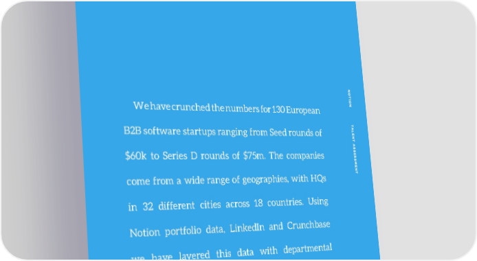 NO TION T We have crunched the numbers for 130 European B2B software startups ranging from Seed rounds of ALENT A S $60k to Series D rounds of $75m. The companies SES SMENT come from a wide range of geographies, with HQs in 32 different cities across 18 countries. Using Notion portfolio data, LinkedIn and Crunchbase we have layered this data with departmental headcounts broken down into three categories: Sales & Marketing, Tech & R&D and Other. 19
