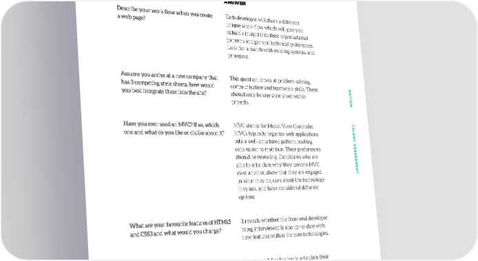 FRONTEND Themes to explore: Organisational capability, user focus, does their process fit yours and are they able to communicate in both technical and non-technical language. QUESTION ANSWER Describe your work flow when you create Each developer will share a different a web page? unique work-flow which will give you valuable insight into their organisational patterns and general technical preferences. Look for a match with existing systems and processes. Assume you arrive at a new company that This question drives at problem-solving, has 3 competing style sheets, how would communication and teamwork skills. There NONO you best integrate them into the site? should only be one style sheet within TION TTION T projects. Have you ever used an MVC? If so, which MVC stands for Model View Controller. ALENT AALENT A one and what do you like or dislike about it? MVCs typically organise web applications into a well-structured pattern, making SS code easier to maintain. Their preferences SESSES should be revealing. Candidates who are able to articulate why they use one MVC SMENTSMENT over another, show that they are engaged in what they do, care about the technology they use, and have considered different options. What are your favourite features of HTML5 It reveals whether the front end developer and CSS3 and what would you change? being interviewed is also up-to-date with new features within the core technologies. Look at the design of our website. Talk Test their ability to clearly articulate their me through the features that draw your creative preferences. Generally, developers attention. What do you like, what do you would need 20–30 minutes to look at the dislike? What would you change? page and underlying implementation, so tell the candidate about this question before the interview - but not too long before. Github has a great mix of language, general and interesting interview questions. 6666