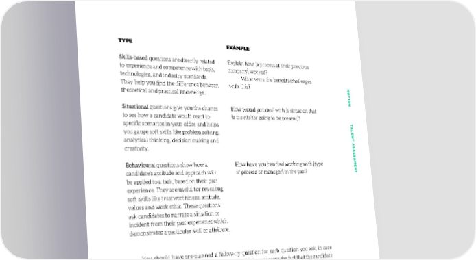 TYPE EXAMPLE Skills-based questions are directly related Explain how [a process at their previous to experience and competence with tools, company] worked? technologies, and industry standards. - What were the benefits/challenges They help you find the difference between with this? NONO theoretical and practical knowledge. TION TTION T Situational questions giv e you the chance How would you deal with [a situation that to see how a candidate would react to is inevitably going to be present]? specific scenarios in your office and helps ALENT AALENT A you gauge soft skills like problem solving, analytical thinking, decision making and SS creativity. SESSES Behavioural questions sho w how a How have you handled working with [type SMENTSMENT candidate’s aptitude and approach will of process or manager] in the past? be applied to a task, based on their past experience. They are useful for revealing soft skills like trustworthiness, attitude, values and work ethic. These questions ask candidates to narrate a situation or incident from their past experience which demonstrates a particular skill or attribute. You should have pre-planned a follow-up question for each question you ask, in case the first question is not adequately answered. Decide how to score the fact that the candidate could not adequately answer the first question. The key to interview questions is to ascertain if the candidate can , will and want to do the job they are applying for. These correlate to skill/competency, motivation/ambition and values/culture. In order to gauge these aspec ts of your candidate you should combine testing with standardised questions. We will go into further detail on this. 5757
